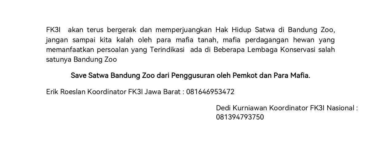 Atas nama kemanusian dan kesejahreaan satwa, kami FK3I Jawa Barat menyuarakan hak-hak hidup satwa yang terancam akibat penutupan Bandung Zoo, walikota sudah berlaku tidak adil dalam mengambil kebijakan sehingga satwa pun terancam pemeliharaanya serta terancam terusir di lahan yang mereka tinggali.